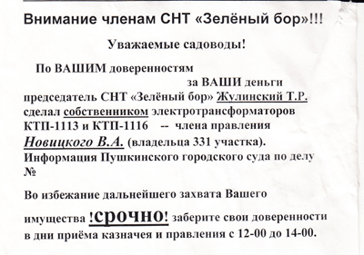 В отношении информации о том, что собственником КТП является член правления Новицкий В.А. сообщаем, что Новицкий В.А. является таким же сособственником сетей с КТП-1113 и КТП-1116, как и остальные дольщики. Доверенными лицами в «МОЭСК» была передана информация о том, что у КТП сменился собственник и в подтверждение была предоставлена имеющаяся выписка из ЕГРН на имя Новицкого В.А., из чего авторами анонимных объявлений были сделаны неверные выводы.